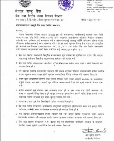 नेपाल राष्ट्र बैंकले बजारमा पैसाको समस्या हुन नदिनका लागि विद्युतीय माध्यमलाई चुस्तदुरुस्त बनाउन बैंक तथा वित्तीय संस्थालाई निर्देशन दिएको छ । विश्वभर फैलिरहेको कोरोना भाइरसका कारण मानवीय क्षति बढ्दै गएपछि सरकारले फिजिकल बैंकिङ प्रणालीलाई बन्द गरेसँगै विद्युतीय माध्यमलाई प्रभावकारी बनाउन निर्देशन दिएको हो । यसैगरी बैंक तथा वित्तीय संस्थालाई एटीएम मिसिनमा प्रयाप्त रकम राखी सोको निगरानी बढाउन दिर्नेशन दिएको छ । साथै बैंक तथा वित्तीय सस्थाहरुले अत्यावश्यक वस्तुहरुको आपूर्तिमा सुनिश्चितता प्रदान ड्राफ्ट, टीटी, प्रतितपत्र तथा बैंक ग्यारेन्टीको व्यवस्था मिलाउन निर्देशन दिएको छ ।
