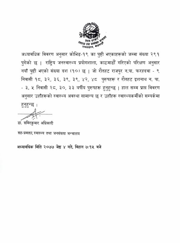 यो सहित नेपालमा कुल संक्रमितको संख्या २९१ पुगेको छ। संक्रमितमध्ये ३६ जना उपचारपछि निको भएका छन् भने एक जनाको मृत्यु भएको छ।