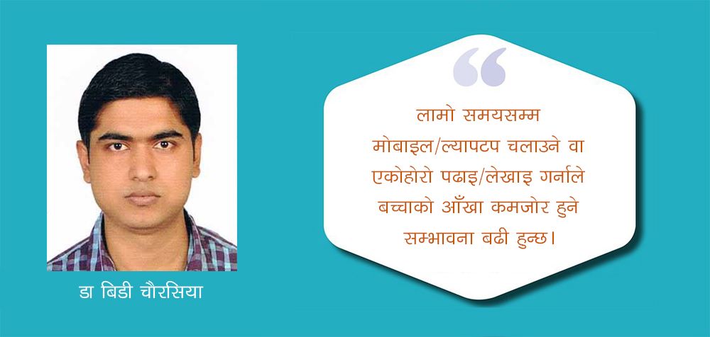 यसका साथै समय-समयमा बच्चाको आँखा जाँच गराउनु पर्छ। लकडाउनको समयमा अभिभावकले यी कुरामा ध्यानमा राखे बच्चाको आँखाको साथ-साथ पढाइ/लेखाइ र मानसिक विकासमा सकारात्मक असर पर्ने छ। जसले तपाईंको परिवार र समाजलाई अघि बढाउन सहयोग गर्नेछ। स्वस्थ्य रहौँ, सुखी रहौँ।