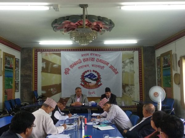 मंगलबार ताहचलस्थित आयोग कार्यालयमा पर्ति, ऐलानी, हैसियत बिग्रेका वनक्षेत्रमा घर बनाउने अनुमति पाएका भूमिहीन तथा मोही, स्ववासी, गाउँ एवं शहरी व्लक लगायतका लाभग्राहीहरुलाई जग्गाधनी पूर्जा दिनेबारे छलफल भएको हो ।