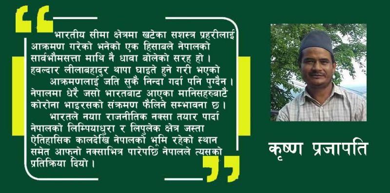 यस्तो समयमा भारतीय मूलका नेपालीलाई यहाँ प्रवेश गराइएन भन्ने एउटा निहुँ राखेर भारतीय पक्षले नेपाली अस्थायी चौकीमाथि आक्रमण गरी एक हवल्दारलाई घाइते समेत पारेको छ । यो अत्यन्तै दुःखद् निन्दनीय घटना भएको छ । सीमा बन्द गरेकै कारण रौतहटमा उक्त महिला नेपाल प्रवेश गर्न नपाएको हो । सीमा बन्द गरिएको कुरा स्वयम् सो महिला पनि जानकार नै थियो । तर के निहुँ पाउँ कनिका बटुलूँ भने झैं गरी भारतीय पक्षले नेपाली प्रहरीलाई आक्रमण गर्ने कार्य गरेको थियो । यो घटनालाई हेर्ने हो भने यो नागरिक स्तरको झगडा मात्रै नभएर एक हिसाबले भारतले पुनः एक पल्ट नेपाललाई हेपाहा प्रवृत्तिले हेरेको घटना झैं देखिएको छ । भारतीय सीमा क्षेत्रमा खटेका सशस्त्र प्रहरीलाई आक्रमण गरेको भनेको एक हिसाबले नेपालको सार्वभौमसत्ता माथि नै धावा बोलेको सरह हो । हवल्दार लीलाबहादुर थापा घाइते हुने गरी भएको आक्रमणलाई जति सुकै निन्दा गर्दा पनि पुग्दैन । यस्तो घटना यो नै पहिलो भने होइन ।