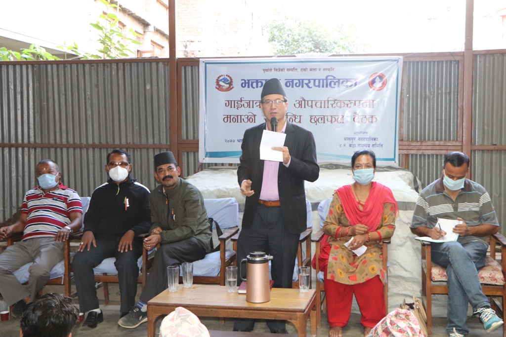भक्तपुर नगरपालिकाका प्रमुख सुनिल प्रजापतिको प्रमुख आतिथ्यमा विश्व महामारी रुपमा फैलिरहेको कोभिड १९ संक्रमण दिन प्रतिदिन बढिरहेको हालको समयमा २०७७ सालको गाईजात्रा पर्वलाई सुरक्षित र औपचारिकतामा सीमित गरी मनाउने सम्बन्धमा शुक्रबार वडाबासी भेला कार्यक्रम भएको छ ।