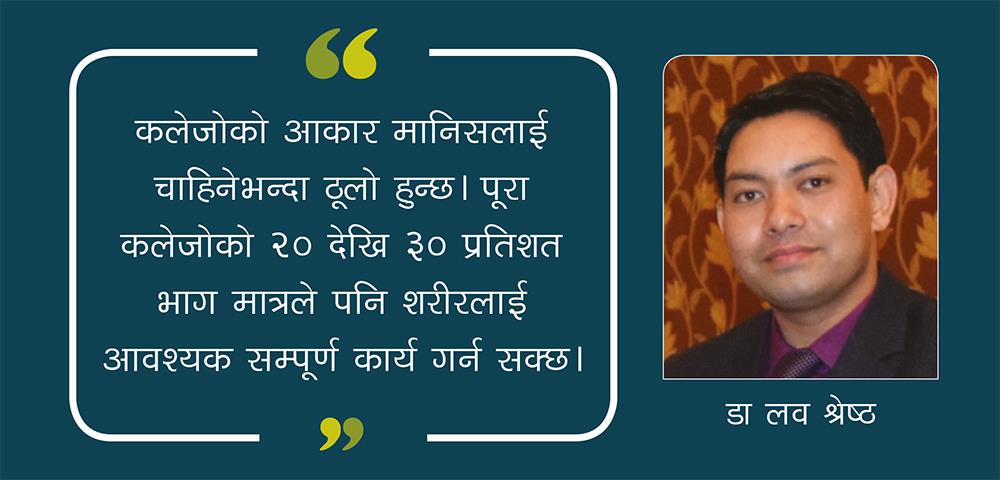 ३. अत्यधिक तौलः तौल बढे सँगसँगै कलेजोमा पनि विस्तारै बोसो जम्न थाल्छ। यसले गर्दा कलेजोले विस्तारै आफ्नो कार्यक्षमता गुमाउँछ।