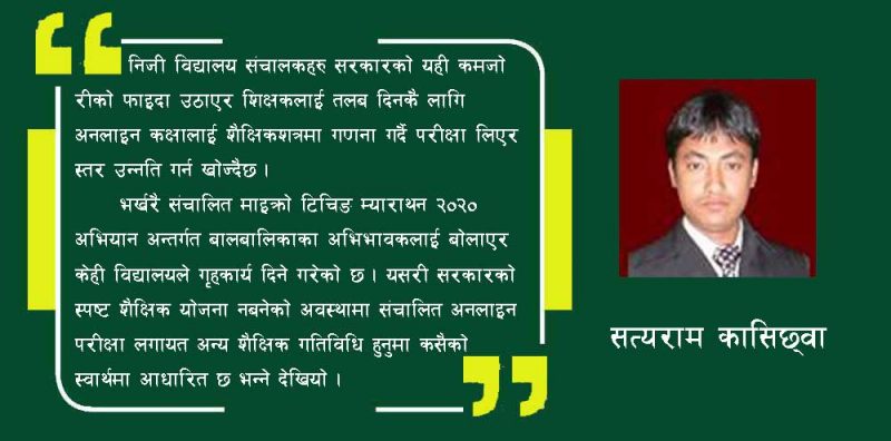 भर्खरै संचालित माइक्रो टिचिङ म्याराथन २०२० अभियान अन्तर्गत बालबालिकाका अभिभावकलाई बोलाएर केही विद्यालयले गृहकार्य दिने गरेको छ । यसरी सरकारको स्पष्ट शैक्षिक योजना नबनेको अवस्थामा संचालित अनलाइन परीक्षा लगायत अन्य शैक्षिक गतिविधि हुनुमा कसैको स्वार्थमा आधारित छ भन्ने देखियो ।