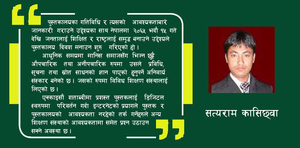 न्यूज अपडेट भक्तपुर, १५ भदाै साधारणतया विभिन्न विधाका विद्वान, लेखक, दार्शनिक, चिन्तक तथा साहित्यकार आदिका विचार तथा भावनाहरुलाई लिपिबद्ध गरिएको पृष्ठहरुको संगठित स्वरुप वा ठेलीलाई पुस्तक भनिन्छ । पुस्तकलाई संस्कृत भाषामा ग्रन्थ भनिन्छ भने जर्मन भाषाको ‘‘BOK’’ बाट पुरानो अंग्रेजी ‘‘BOC’’ हुँदै ‘‘BOOK’’ हुँदा अरबी भाषाबाट ‘‘किताब’’ मा आउँदा नेपाली बोलिचालीमा किताप सम्म भएको छ । नेपाली बृहत शब्दकोशमा पुस्तकको अर्थ पढ्ने, पढाउने उद्देश्यले तर्क विचार, भावना, ज्ञान विज्ञान आदिका कुरा लेखिएको छापिएको ग्रन्थ भनिएको छ । मानिस एक गतिशील सामाजिक उतरदायित्व बहन गर्ने प्राणी भएको हुँदा उसले प्राप्त गरेका भाषा, अनुभव, ज्ञान, सीप र कला कौशललाई संरक्षण सम्वर्दन गर्दै भविष्यको पुस्ताका लागि हस्तान्तरण गर्न विभिन्न विधि प्रविधिका स्रोत साधनको उपयोग गरिन्छ । जहाँ प्राचीन […]