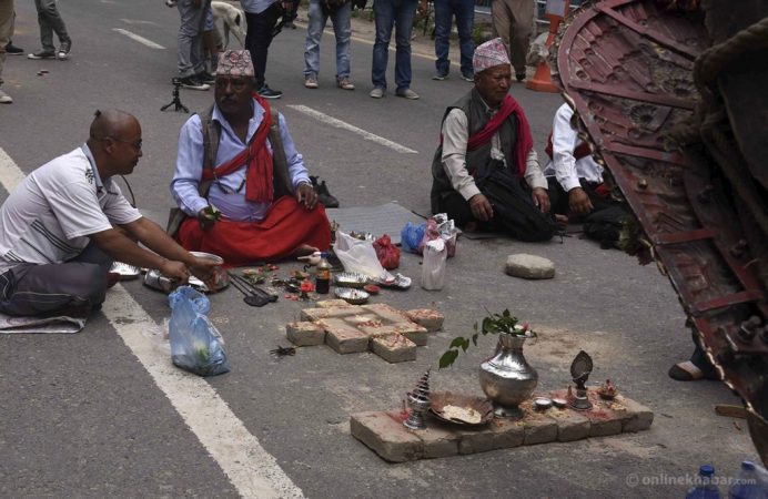 बिहीबार दिउँसो भएको झडपपछि असामान्य बन्दै गएको स्थितिलाई साम्य पार्न विभिन्न जातीय संगठन, गुठी संस्थान, जिल्ला प्रशासन कार्यालयलगायतका प्रतिनिधिको बैठकले गरेको निर्णयअनुसार छोटो विधिबाट रथयात्रा गर्न शुक्रबार क्षमापूजा गरिएको हो ।