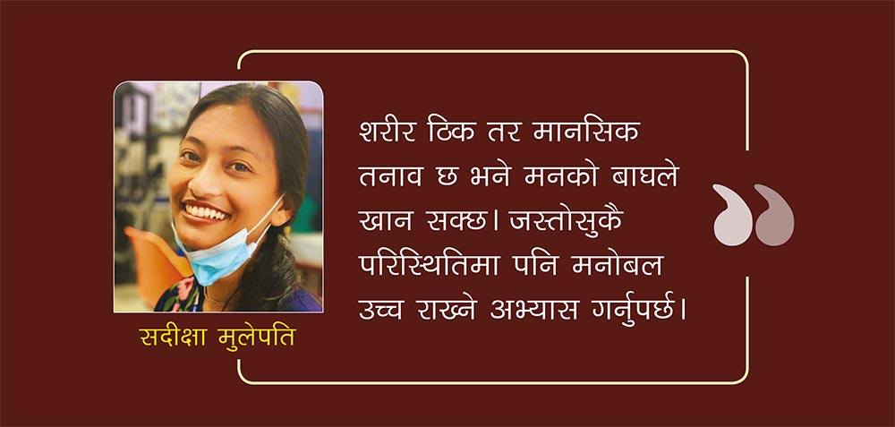 शरीर ठिक तर मानसिक तनाव छ भने मानिसलाई मनको बाघले खान सक्छ। जस्तोसुकै परिस्थितिमा पनि मनोबल उच्च राख्ने अभ्यास गर्नुपर्छ।