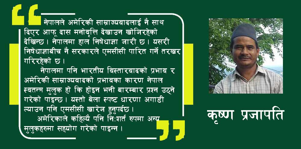 नेपाली जनताको व्यापक विरोधको बावजूद पनि नेपाल कम्युनिष्ट पार्टीको सचिवालय बैठकले मिलिनियम च्यालेन्ज कर्पोरेशन (एमसीसी) पारित गर्ने निर्णय गरेको छ । अमेरिकी शताब्दी चुनौती मिलिनियम च्यालेन्ज कर्पोरेशन एउटा अमेरिकी साम्राज्यवादको आधुनिक हतियार हो । सीधै सेना पठाएर आक्रमण गर्नुको सत्ता सेनाले सुरक्षा गरी विभिन्न रुपमा लगानी देखाएर स्थानीय जनतालााई नजानिँदो तरिकाले दास बनाउने यो अमेरिकी सोच हो । त्यसैले सेवा गरेको देखिने तर अधिकारबाट वञ्चित हुने कुरो चाल नपाउने भएकाले सचेत हुन नसकेका कयौं मुलुकमा हाल अमेरिकी साम्राज्यवादले यो कर्पोरेशन लागू गरी धमाधम आफ्नो हैकम कायम गरिरहेको अवस्था छ । विश्वमा जहाँ रहेका भएपनि काग कालै हुन्छ । त्यसैगरी शोषकहरु भनेका विश्वको कुनै पनि स्थानमा रहेका भएपनि अत्याचारी र भ्रष्टाचारी नै हुन्छन् । अरुलाई शोषण गर्ने र आफू खुसी शासन सत्ता सञ्चालन गर्ने अमेरिकी साम्राज्यवादको धर्म नै हो । विश्वको जुनसुकै देशमा बसेर पनि उनीहरुले हालसम्म गरिरहेको भनेको त्यस्तै मात्रै हो । कहिल्यै पनि उनीहरुले जनताको हितमा काम गरेको पाईंदैन ।