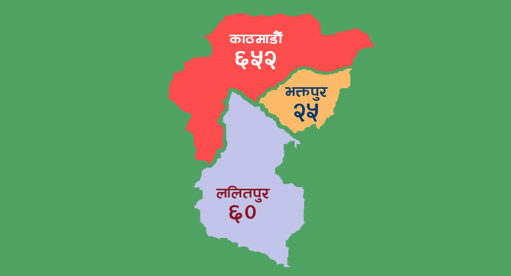 स्वास्थ्य तथा जनसंख्या मन्त्रालयका अनुसार काठमाडौंमा ५५५, ललितपुरमा ३५ र भक्तपुरमा ८६ जनालाई कोरोना संक्रमण देखिएको छ।