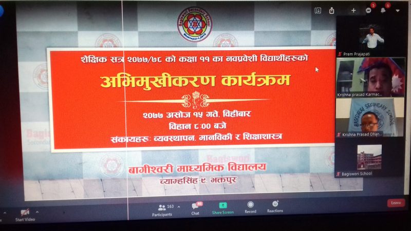 वागीश्वरी माध्यमिक विद्यालयमा यस वर्ष कक्षा ११ मा अध्ययन गर्न आएका नवप्रवेशी विद्यार्थीहरुका लागि बिहीबार अनलाइनमार्फत स्वागत तथा अभिमुखीकरण कार्यक्रम भएको छ ।