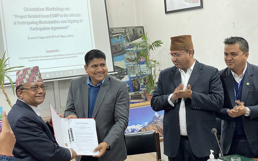 बबरमहलस्थित शहरी विकास तथा भवन निर्माण विभागको कार्यालयमा विहिबार आयोजित कार्यक्रममा संघीय सरकारको तर्फबाट शहरी विकास तथा भवन निर्माण विभागका महानिर्देशक नवराज प्याकुरेल र स्थानीय सरकारको तर्फबाट नगर प्रमुखहरुले अनुदान सम्झौतामा हस्ताक्षर गरेका हुन् । बिश्व बैंकको साढे १७ अर्ब रुपैया ऋण सहयोगमा सञ्चालनमा आएको नेपाल सहरी शासकीय र पूर्वाधार आयोजनाले मुलुकभरका विभिन्न ३३ नगरपालिकालाई सहयोग गर्ने कार्यक्रम अनुसार विहिबार १२ वटा नगरपालिका प्रमुखसँग हस्ताक्षर भएको हो ।