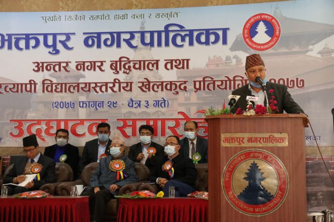 भक्तपुर नगरपालिकाको आयोजनामा २०७७ फागुन २९ गतेदेखि चैत्र ३ गतेसम्म हुने अन्तर नगर बुद्धिचाल प्रतियोगिता र भक्तपुर नगरव्यापी विद्यालयस्तरीय खेलकुद प्रतियोगिताको उद्घाटन कार्यक्रम शनिबार सम्पन्न भयो । सहिद दिवसको अवसरमा आयोजित उक्त खेलकुद प्रतियोगिता कार्यक्रमको उद्घाटन नेपाल मजदुर किसान पार्टीका केन्द्रीय अध्यक्ष नारायणमान बिजुक्छें (रोहित)ले पानसमा दिप प्रज्ज्वल गरी गरे ।