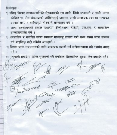बैठकले जात्रा सञ्चालनको प्रत्यक्ष प्रसारण टेलिभिजन, रेडियो, एफ.एम, र सामाजिक सञ्जालमार्फत गर्ने र अनुशासित र मर्यादित रुपमा स्वास्थ्य मापदण्ड पालना गरी सभ्य रुपमा जात्रा सम्पन्न गर्न माइकिङ गरी सबैसँग आग्रह गर्ने निर्णय गर्याे ।