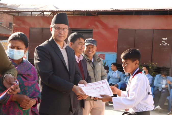 त्यस्तै गरी मंगलबार भक्तपुर नपा वडा नं. ५ को विद्यार्थी निकेतनमा सम्पन्न टेक्वाण्डो प्रतियोगिताको समापन कार्यक्रममा नगर प्रमुख प्रजापतिले प्रतियोगिताका विजयी खेलाडीहरुलाई मेडल र प्रमाणपत्र वितरण गरेको थियो ।