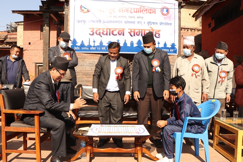 भक्तपुर नगरपालिकाका प्रमुख सुनिल प्रजापतिले भक्तपुर नपा वडा नं. ९ को आयोजनामा भएको भक्तपुर नगरव्यापी विद्यालयस्तरीय खेलकुद प्रतियोगिताअन्तर्गत कसिमला पायँ र बुद्धिचाल प्रतियोगिताको संयुक्त रुपमा बुधबार दत्तात्रय परिसरमा उद्घाटन गरे ।
