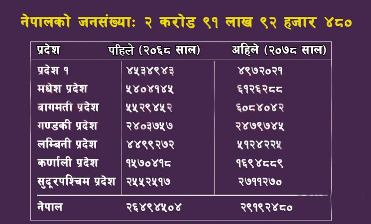 नेपालको जनसंख्या दुई करोड ९१ लाख ९२ हजार ४८० पुगेको छ।