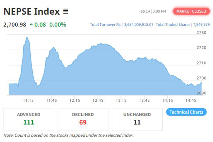सोमबार १११ कम्पनीको सेयर मूल्य बढ्दा ६९ कम्पनीको मूल्य घट्याे भने ११ कम्पनीको मूल्यमा कुनै परिवर्तन भएन ।