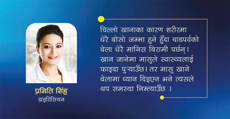 चाडबाडमा खानपिनकै कारण स्वस्थ मानिस पनि बिरामी हुने दर बढी हुन्छ। अझ दीर्घरोगी त झन् बढी खतरामा रहन्छन्। त्यस कारण चाडपर्वको बेला खानपिनमा विशेष ध्यान दिन जरुरी छ। चाडबाडमा मासुका परिकार र चिल्लो खाना ठिक्क खाने र सँगसँगै तरकारी, फलफूल  सलाद, दाल सबै मिलाएर खायो भने स्वस्थ्यमा धेरै लाभ हुन्छ। चिल्लो खानाका कारण शरीरमा धेरै बोसो जम्मा हुने हुँदा चाडपर्वको बेला धेरै मानिस बिरामी पर्छन्। खान जानेमा मासुले स्वास्थ्यलाई फाइदा पु¥याउँछ। तर मासु खाने बेलामा ध्यान दिइएन भने त्यसले थप समस्या निम्त्याउँछ।